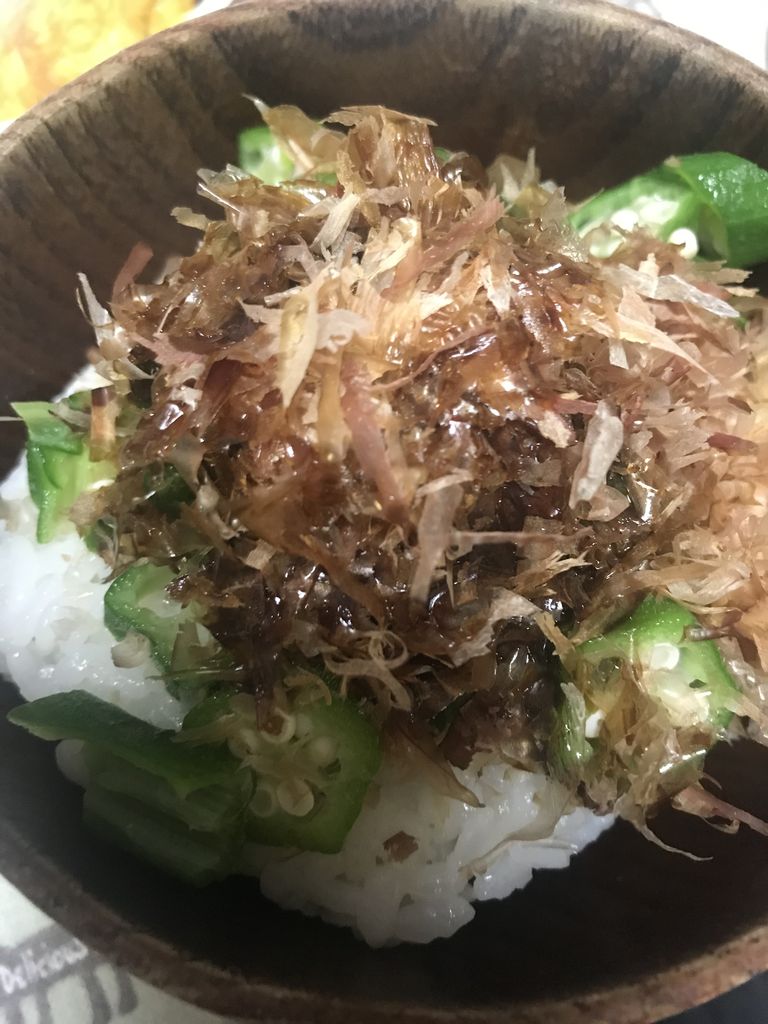 刻んだオクラの上にかつおぶしを乗せて醤油垂らしたものと、写真はないけど卵焼き。